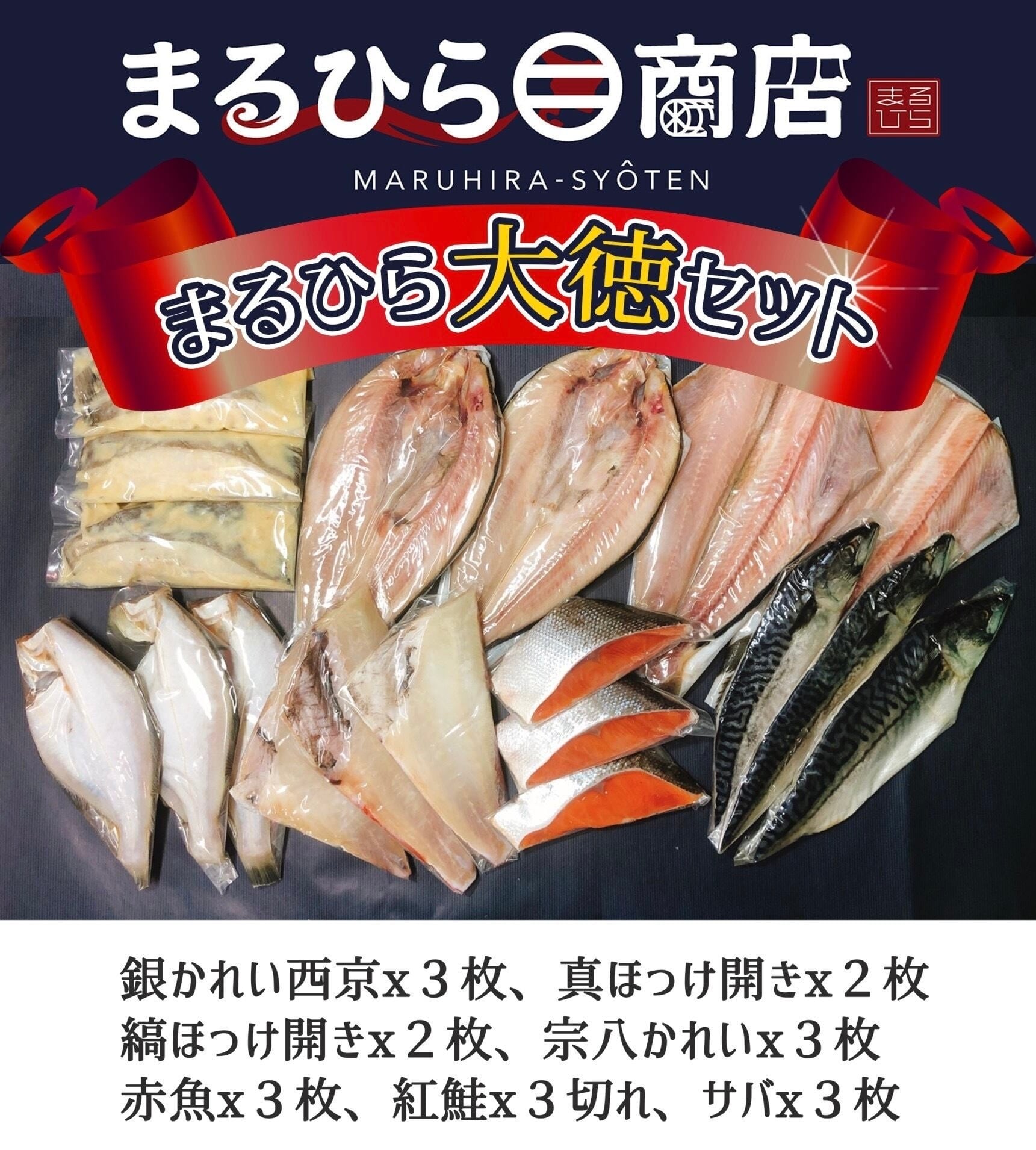 :内容 銀かれい西京漬け3切 真ほっけ開き(中)2枚 縞ほっけ開き2枚 宗八かれい(中)3枚 赤魚3枚 紅鮭3切 とろさば3枚 定価11260円の内容 まるひら㊁商店の一夜干しと漬魚をお得に満足に楽しめるセットになってます。 賞味期限120日(冷凍) 解凍後はなるべく早く加熱調理して喫食して下さい。
